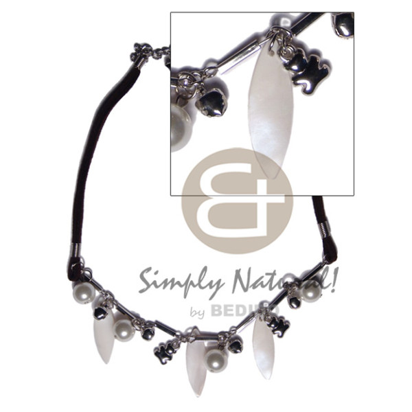 dangling 30mmx10mm kabibe shells metal, pearl beads and double layer leather thong combination..