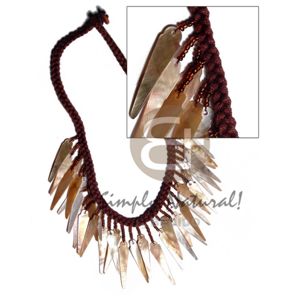 36pcs. dangling 32mmx8mm brownlip sticks in brown macrame / 16 in..