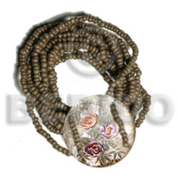 10 layers elastic dark olive green 2-3mm coconut Pokalet. 35mm round handpainted hammershell..
