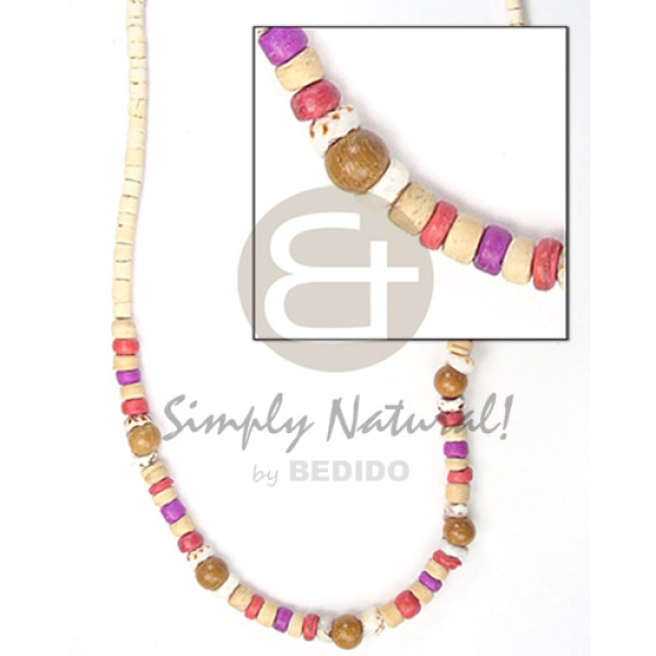 2-3mm coconut heishi bleach 4-5mm coconut Pukalet combination violet/red/nat tiger puka & wood bea..