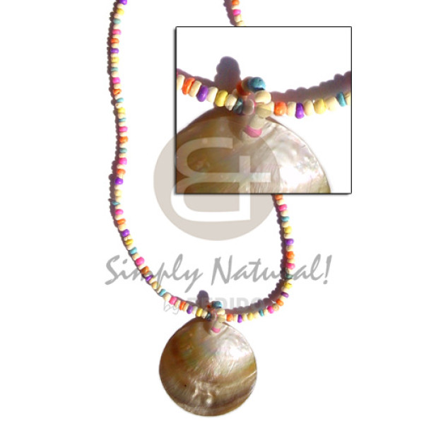 candy colored 2-3mm coconut pukalet 30mm round brown lip pendant..