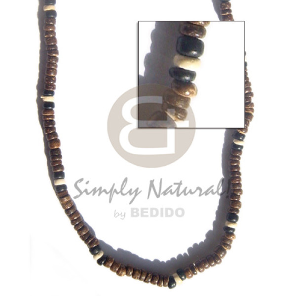 4-5 coconut heishi nat/ wood beads/ 35mm black horn round flat and tassles..
