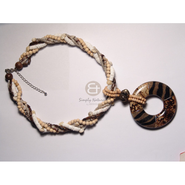 2 layer knotted brown cord buri, & palmwood beads accent and 45mm flower coconut pendant..