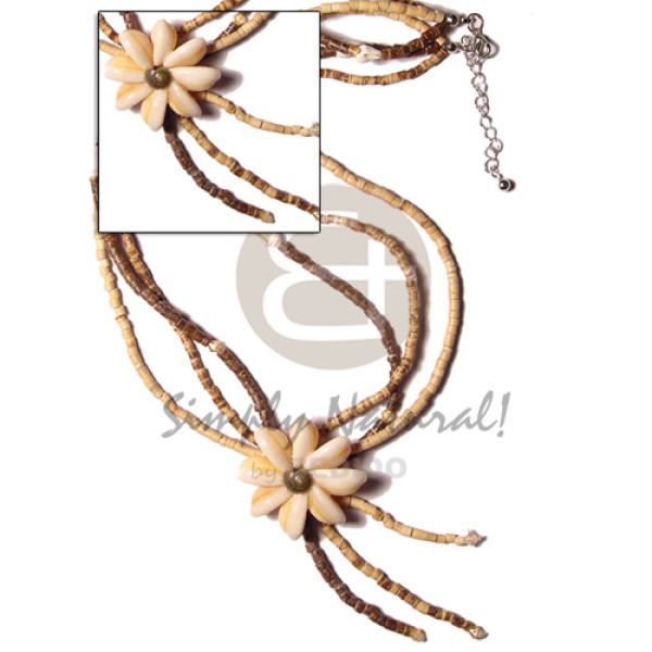 6 layers intertwined 4-5mm coconut Pukalet 15mm round wood beads and gold ball rings 35mm flat woo..