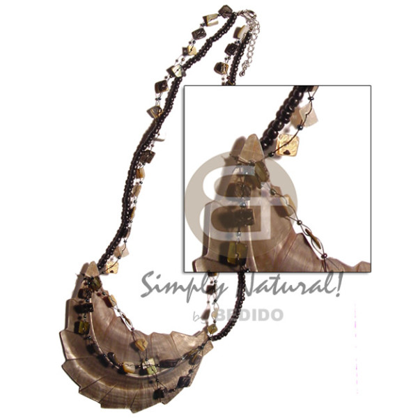 2-3mm coconut heishi nat. buri seed, wood bds and 40mm scallop MOP pendant..