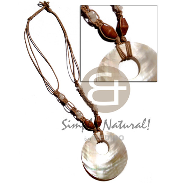 55mm brownlip round shell pendant in 3 layers wax cord wood & buri nuggets beads accent..