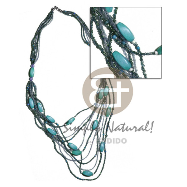 5 rows graduated multilayered glass beads twisted wood beads / aquamarine tones / 32 in..