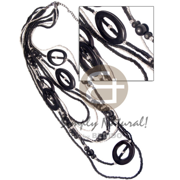 6 rows graduated white glass beads and black 2-3mm coconut heishi 45mmx30mm black oval woods rings..