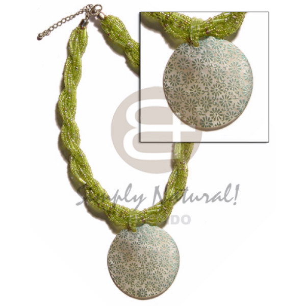 12 rows lime green twisted glass beads matching round handpainted/embossed 45mm hammershell pendant..
