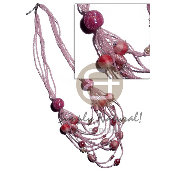 5 rows graduated multilayered light pink glass beads wrapped and buffed bleached wood beads accen..