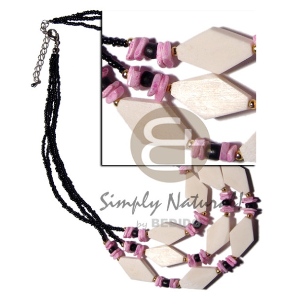 3 rows black glass beads carabao diamond white bone, white rose in pink combination..