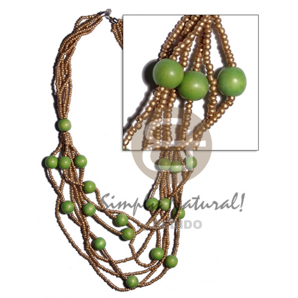 5 rows graduated multilayered 2-3mm coconut Pukalet in gold lime green 15mm round wood beads acce..