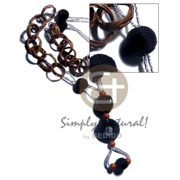 basket rings kukui nuts/15mm wrapped wood beads/ 30mm wrapped wood ring and glass beads / 32in./ in..