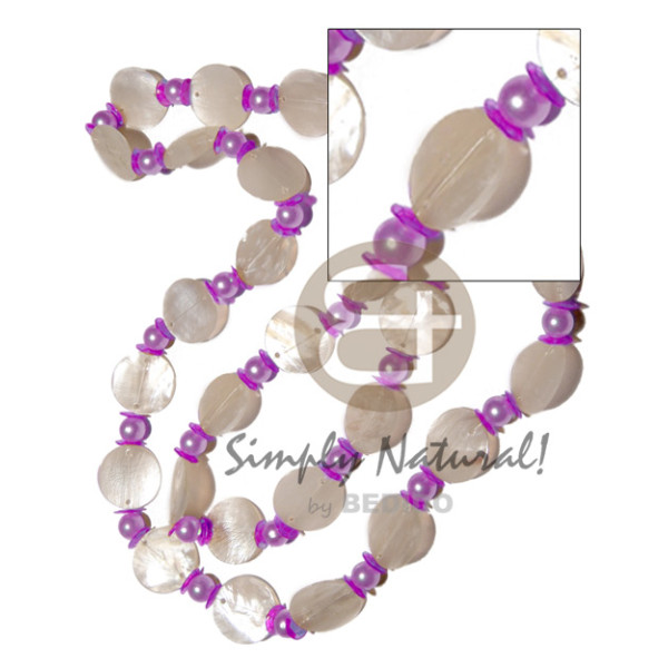 27 pcs. single row 25mm nat. white round hammershells lilac tones pearl beads and sequins accent / ..