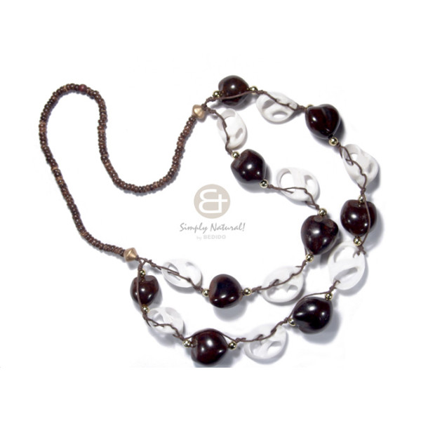 4-5mm coconut nat. brown 2 graduated rows of kukui nuts and sliced vertagus shell in wax cord go..