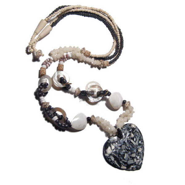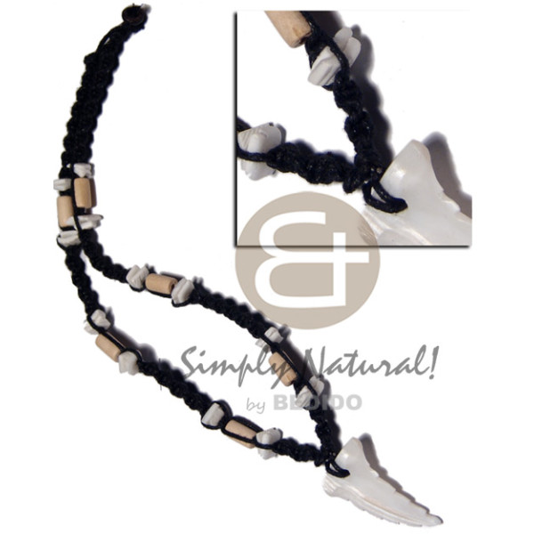 35mmx25mm kabibe shell fang pendant in black macrame white rose shell & tube nat. white wood accent..