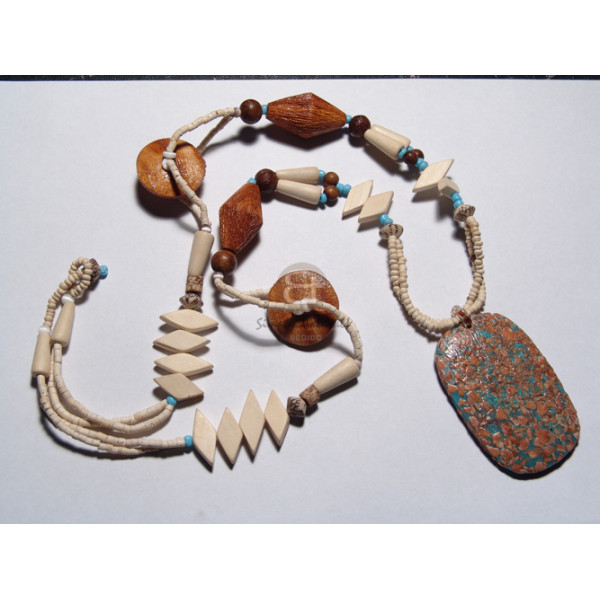 clay tribal mask on 60mmx40mm rectangular driftwood gemstone accent /adjustable black wax cord /t..