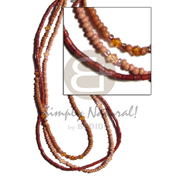 3 rows coconut heishi and Pukalet brown graduated tones/acrylic crystals..