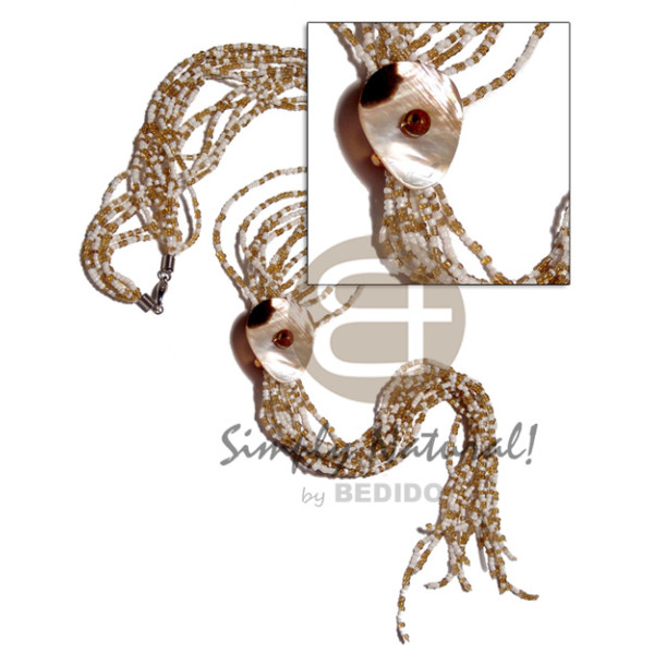 scarf necklace / 7 rows golden/white glass beads 30mmm teardrop brownlip tiger adjustable stopper /..