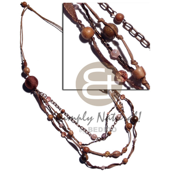 brown tones /2 layers wax cord matching wrapped 20mm wood beads, 4 graduated layers of metal chain,..