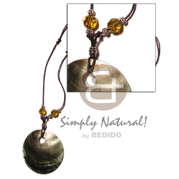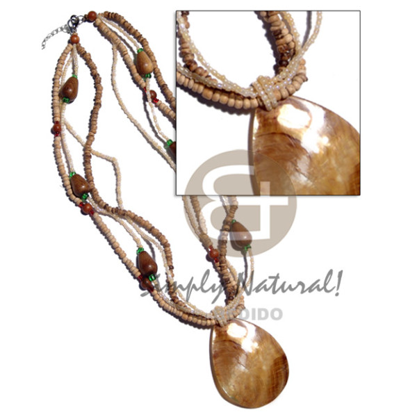 70mm sliced shell pendant crushed limestones filling on 6 rows neckline- 2 rows 2-3mm coconut heis..