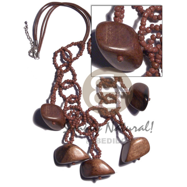 dangling camagong tiger hardwood chunks on brown glass bead rings and 2 rows matching wax cord / ..