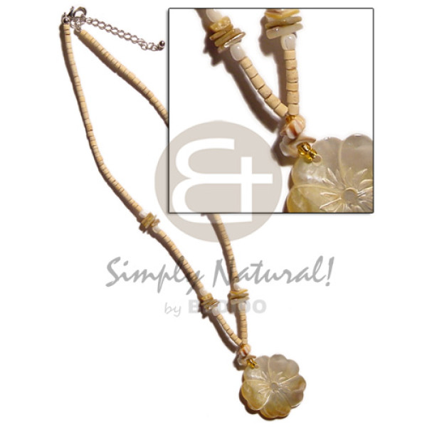 2-3mm coconut heishi nat. shell beads accent & 5 hearts 35mm MOP flower pendant..