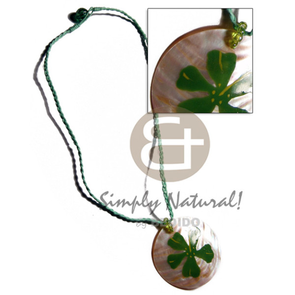 mint green braided wax cord handpainted 50mm round MOP pendant / 18in..