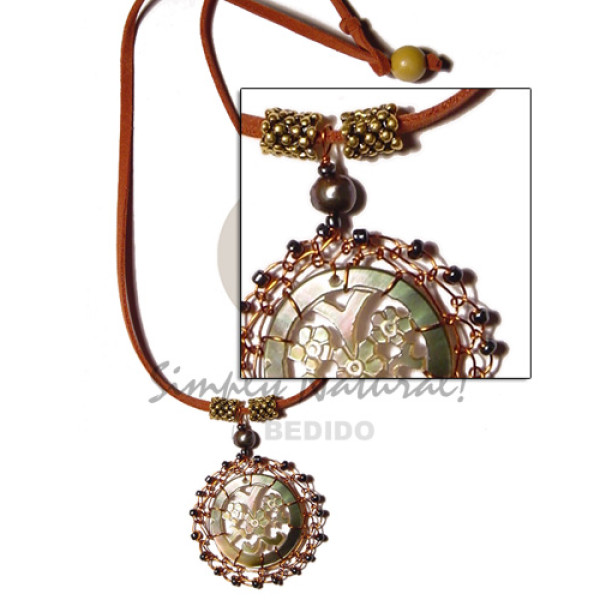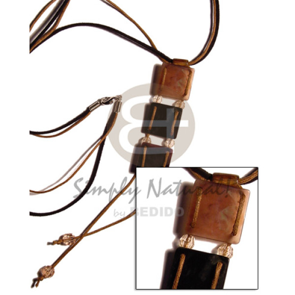 50mmx18mm triangular laminated cracking brownlip pendant backing on 3 rows leather thong..