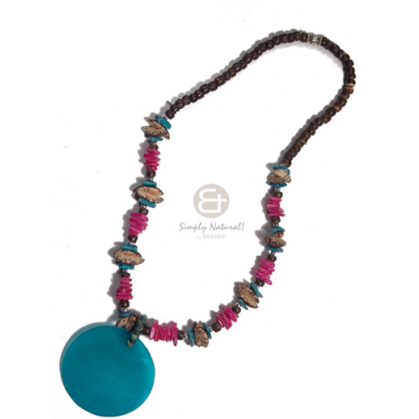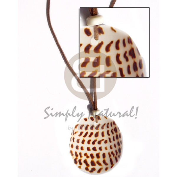 4-5 coconut Pukalet bl. 50mm coconut pend. tiger burning design & white nassa shell accent 18 inc..