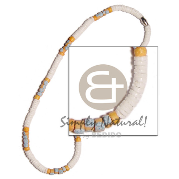 3 rows 2-3mm nat. white coconut heishi buri ntiger nuggets/glass beads accentand 40mm r0und wood pe..