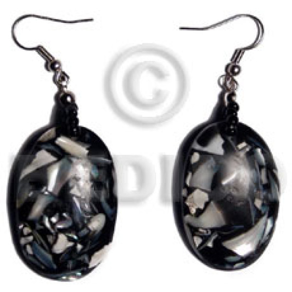 dangling 36mmx24mm oval laminated troca chips in black resin..