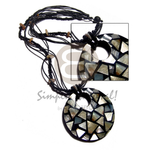 60mm round MOP chips inlaid on black resin 2 rows black beads crystal nuggets accent and 3 rows bl..
