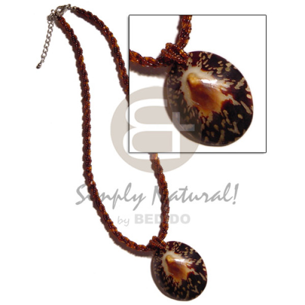 3 rows twisted brown glass beads 40mm oval limpit shell pendant..