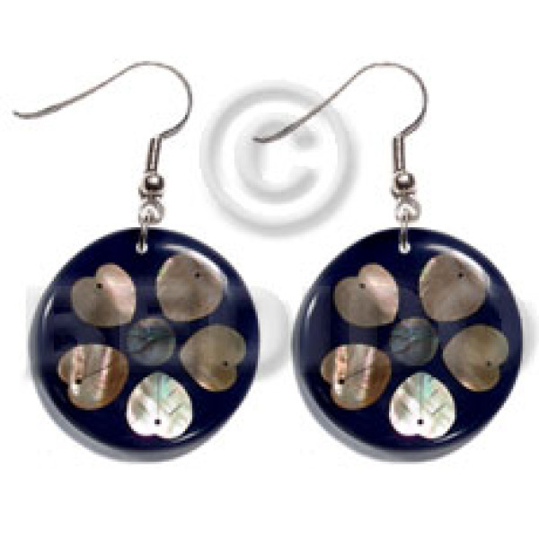 dangling heart 35mm laminated paua/hammershell combination black resin backing..