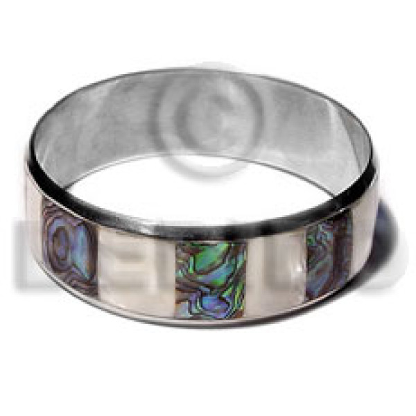 laminated brownlip/paua alternate in 3/4 inch stainless metal / 65mm in diameter..
