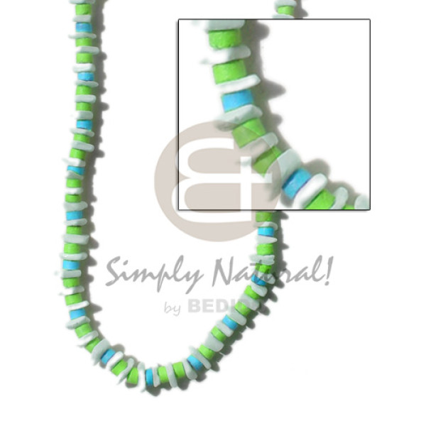 sq. cut white rose 4-5 mm aqua blue/bright green coconut heishi alternate..