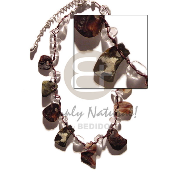 4 r0ws dark brown wax cord 16 pcs. 40mmx25mm laminated eyelet capiz in dark amber tones / 34in..