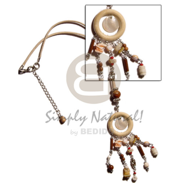 nat. wood ring dangling round hammershell, asstd.shells,bamboo & wood beads looping tassle on wax c..