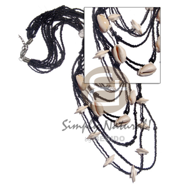 8 layers black glass beads in graduated layers sigay shell, white rose and nat. white wood slidecu..