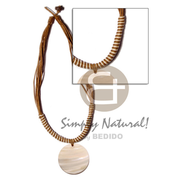 5 layers wax cord bayong wood beads and 65mmx45mm laminated in resin capiz circles in oval pendant..