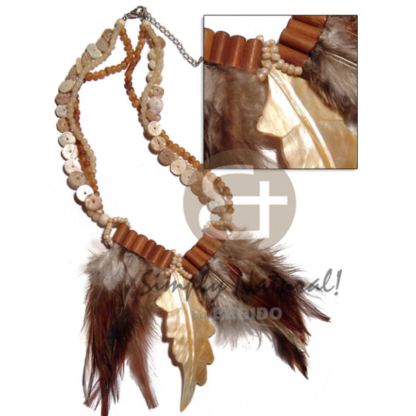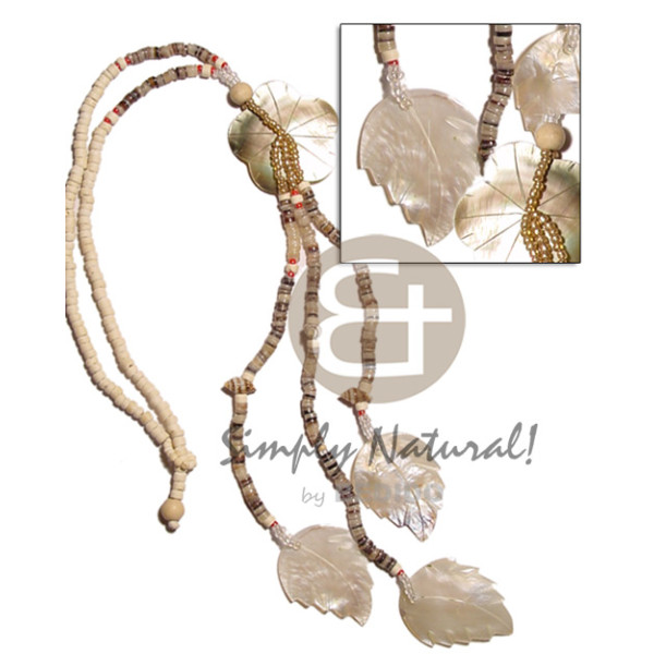3 layers horn beads and floating shell heishi feather on bamboo tube and 80mmx35mm MOP leaf pendant..