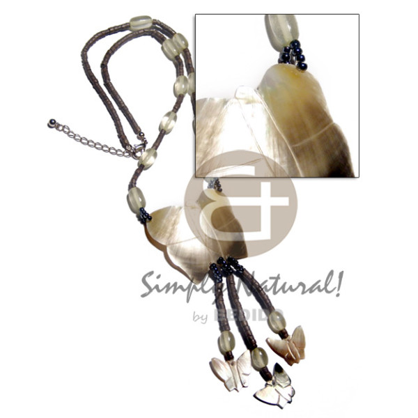 2-3mm dark gray coconut heishi resin tube accent and 45mmx50mm blacklip lip butterfly pendant tass..