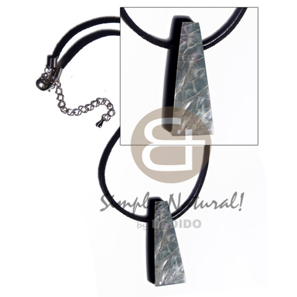 48mmx18mm triangular laminated cracking green shell pendant backing on leather thong..