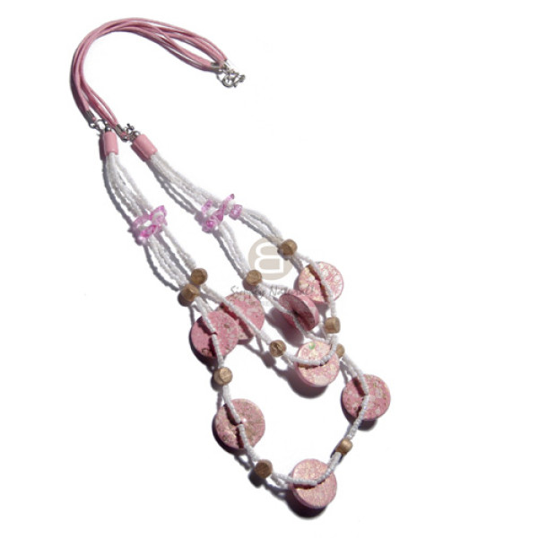 3 layers 2-3mm coconut heishe,glass beads wax cod in pink tones 5 pcs. 15mm round brownlip accent..