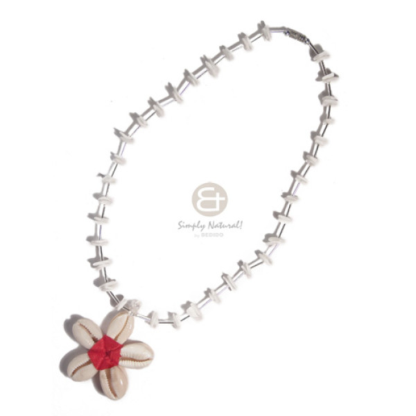 3 rows 2-3mm coconut Pokalet. bleach & glass beads dangling 25mm MOP flower, 40mm MOP round pendant..