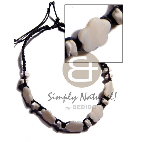 35mm blacklip flower in knotted wax cord buri seed beads & shell accent..