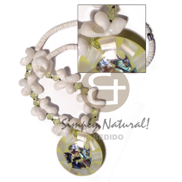 neon green 2-3mm coconut heishi wire choker buri & troca beads accent 45mm flower hammershell gro..