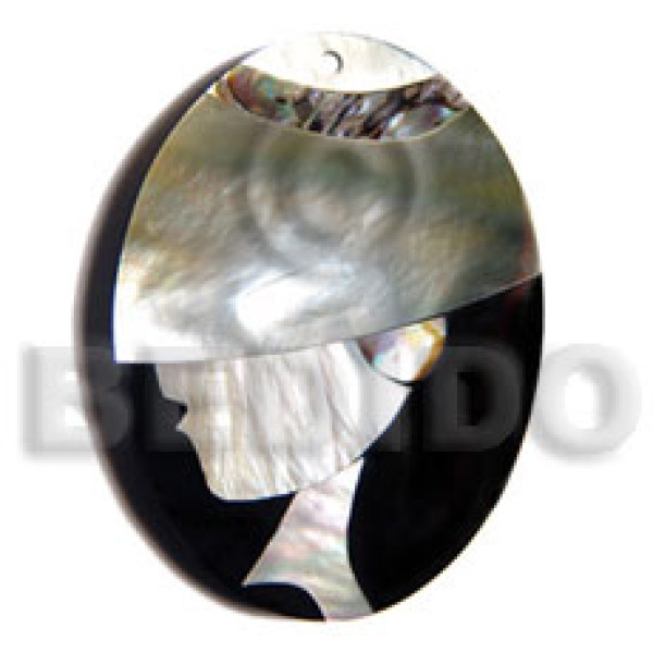 50mmx38mm oval pendant /elegant hat lady delicately etched in shells - brownlip, blacklip and paua c..