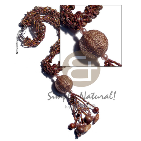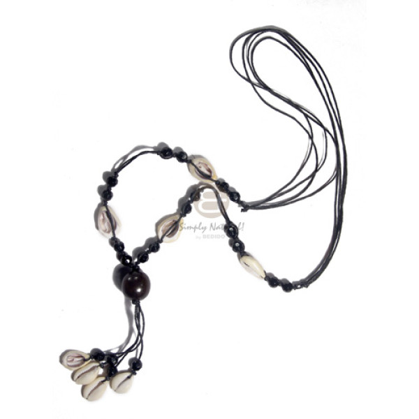 4 rows black wax cord tassled sigay flowers and round 20mm wood beads combination / 28in plus 2in t..